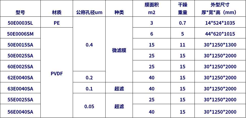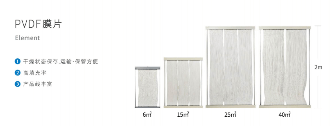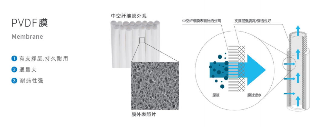 核心采用带支撑层的PVDF膜材,通量大、耐药性强,可干燥保存,便于运储;膜面积覆盖6~40m²,适配不同规模项目。